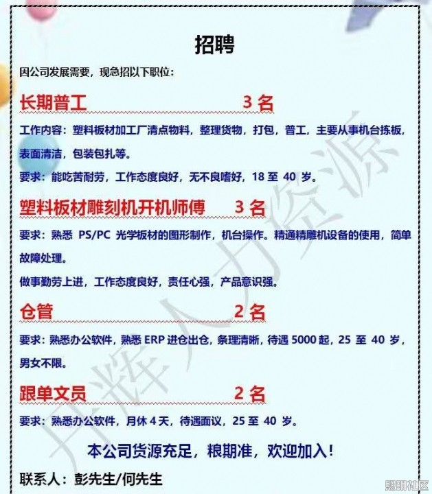 招聘:仓管,跟单文员,雕刻机开机师傅,普工因公司发展需要,现急招以下职...